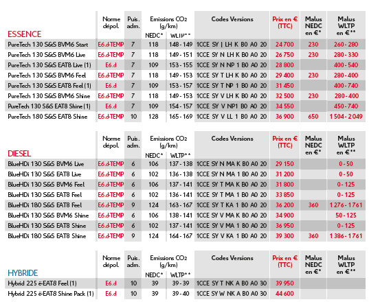 Du côté de la gamme hybride rechargeable, celle-ci est également réaménagée mais dans une moindre mesure. La finition d'accès Feel est inchangée tant en tarifs qu'en équipements. Une version Shine apparaît au tarif de 43 450€, elle ajoute à la dotation Shine classique le chargeur embarqué de 3.7 Kw ainsi que le rétroviseur intérieur électrochrome. Enfin, la finition Shine Pack voit son tarif augmenter de 500€.