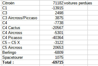 Que conclure de ses chiffres ? D'abord, Citroën n'est pas la seule marque a baissé et sa baisse n'est pas la plus importante, signe que ses difficultés sont aussi liées à celles du marché automobile en général. Ensuite, Citroën souffre beaucoup de la perte de voitures qui n'ont pas été remplacées notamment avec le C4 Picasso dont la perte représente, à elle seule, 40 000 unités sur les 71 000 ventes que la marque a perdu entre 2015 et 2022. Enfin, les nouveautés de la marque font, pour certaines, mieux que leurs homologues en 2015, notamment pour C3 et C3 Aircross ce qui n'est pas le cas pour Renault et Peugeot. Pour C4 et C5 X, si les chiffres sont inférieurs, leurs performances sont meilleures que leurs concurrentes de Renaut ou Peugeot.