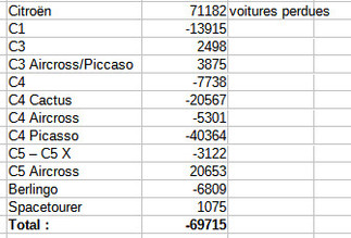 Car, oui, il faut surveiller les ventes des deux autres marques françaises sur la même période pour voir où est réellement le niveau de Citroën. Ainsi, en comparant les mêmes données pour Peugeot, on se rend compte que la marque au lion est en baisse de près de 25% alors qu'elle n'a perdu que la 108, l'ensemble de sa gamme était déjà présente en 2015 et que touts les modèles, à l'exception des 208, 3008 et 5008, affichent de fortes baisses.