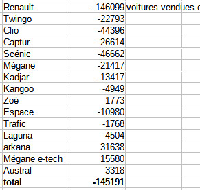 Sauf qu'il y a une erreur de total dans le tableau Renault. L'arkana et la Mégane e tech sont comptés en 2015 alors qu'elles devraient être dans la colonne 2022. Ce qui fausse le total et donc le reste