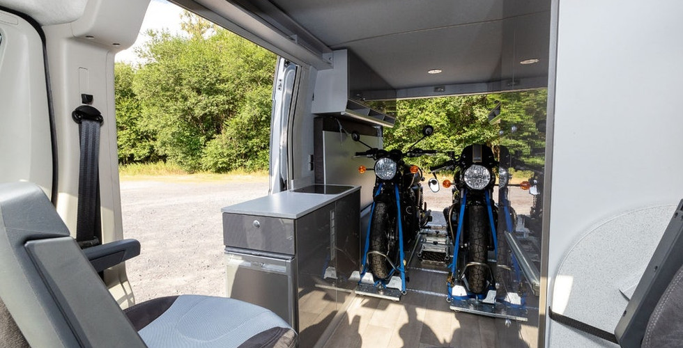 Pour ce faire, Citroën s'est associé avec une société allemande Flexebu qui a conçu ce système permettant de charger deux motos à l'arrière du Jumper sans sacrifier aux capacités et aux multiples aménagement qui prévaut dans un van aménagé tels que la cuisine centrale, le toit ouvrant avec lit, etc.