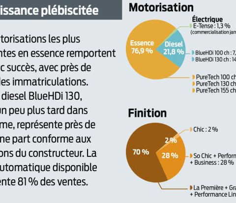 Du côté des moteurs, ce sont les moteurs essence qui représentent la majorité des ventes avec 60% du total dont 43.4% pour le seul moteur puretech 130 et 21.6% pour le puretech 155. Le Diesel, arrivé plus tard, est conforme aux prévisions avec 15% des ventes. Enfin, la boîte automatique représente 81% des ventes du DS3 Crossback.