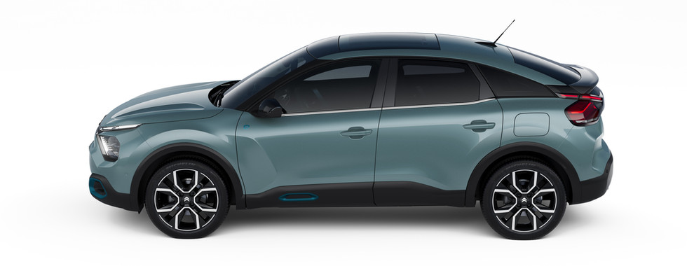La bande sur les panneaux des portes avant et arrière peut être remplacée, sur Nouvelle ë-C4 - 100% ëlectric et au choix du client, par un décor film bleu-vert à motif graphique chevrons, pour réveiller les ambiances les plus sobres et renforcer l’atmosphère d’une pointe de couleur électrisante en lien avec le mode de traction électrique.