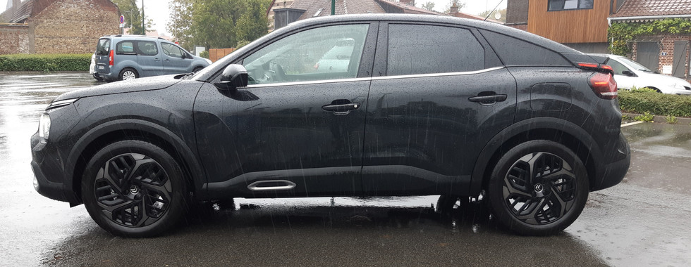 Voir en vrai la voiture permet également de prendre en compte le travail sur la carrosserie qui est vraiment incroyable même si dans cette configuration toute noire et sous la pluie, ce n’est pas gagné. Les arrêtes se font plus vive, le modelé du capot est prononcé, plus que l’on pouvait s’y attendre et, s’il garde un esprit de famille avec le C5 Aircross, le temps des Citroën lisse comme un galet semble révolu. Les passages de roues, bien prononcés, participent à l’aspect bondissant revendiqué par cette C4. La face avant est imposante mais pas massive, contrairement à un Peugeot 2008 par exemple. Celle-ci semble fendre l’air, on sent que le travail aérodynamique est poussé sur cette C4. Et si les traits se font très saillants, trop peut-être notamment sur les phares, la face avant de cette C4 est vraiment agréable à l’oeil et, si elle évolue par rapport à la gamme actuelle, elle le fait modérément si bien que les passants croisés l’identifient immédiatement comme une Citroën. C’est à l’arrière où ces derniers semblent perdus. C’est bien une Citroën mais laquelle ? Encore fortement inconnue, la nouvelle C4 surprend les curieux. L’arrière, qui concentre les critiques notamment via ses feux « tarabiscotés », passe nettement mieux en vrai qu’en photo. Certes, les feux sont compliqués, ils sont composés d’un gros bloc sur lequel des petites parties s’ajoutent, la couleur noire aide puisqu’elle intègre et efface le becquet, le bandeau et la partie noire des feux. Il faudra voir dans d’autres couleurs, comment l’arrière est réellement. Là aussi, les modelés sont travaillés, mais moins saillants que sur la face avant, ils se font plus doux, on retrouve ici l’esprit des Citroën plus lisses. Le coffre, d’une capacité de 380 litres, se révèle très carré, avec des surfaces parfaitement exploitables et un seuil de coffre bas et très pratique.
